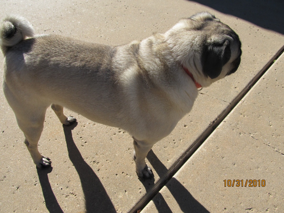 Description: Say hello to Yoda! Yoda comes to Pug Rescue because his family did not want him any longer. He is a sweet boy, and is now looking for his forever home. Yoda did come to us with all his medical records, and he's been well cared for medically, but he has never been a house dog. Yoda has lived his whole life in the yard, and sleeps in a crate in the garage at night. Yoda is very comfortable and clean in his crate, which should make potty training him easy. He is not "officially" potty trained, because he's never been inside until now, but his foster mom says he's been hanging out in the kitchen and is doing great. He gets along well with the other Pugs in the house, and is a very laid back sort of guy. We are told that Yoda got along well with the grandkids, so he would likely be just fine in a home with respectful children. Yoda's holiday wish is to find his forever family, so he can spend the rest of his life as pampered house pet, cuddling on the couch and being your best friend. Let's show this sweet little guy how Pugs are really supposed to live!How can you resist that little face? Contact us if you are interested in meeting Yoda! Update 12/31/10 - Yoda is back with Pug Rescue today, as the family dogs in Yoda's new family did not like him. Yoda is a fantastic little guy, who loves everyone - won't you make his New Year bright by giving him a forever home? |